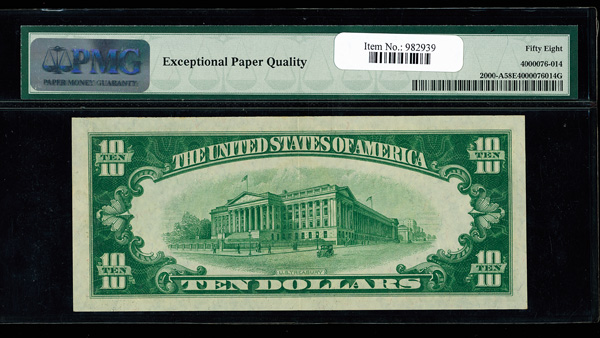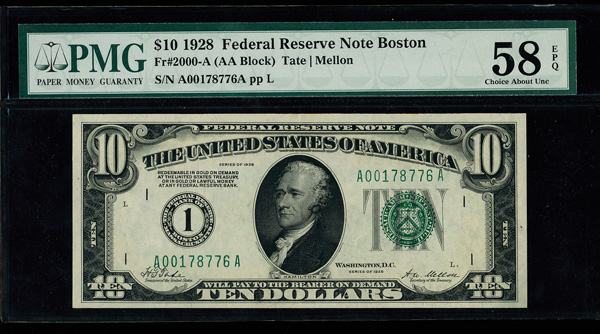 Fr. 2000-A 1928 $10 Federal Reserve Note Boston PMG 58 Choice About Uncirculated EPQ (Fr-2000-A), PMG graded Choice About