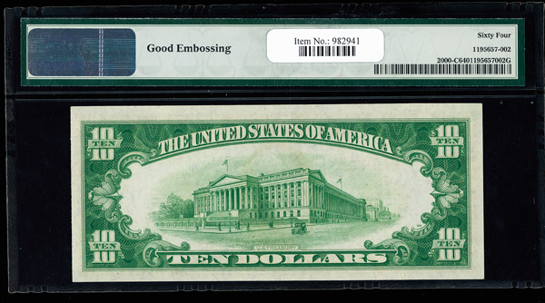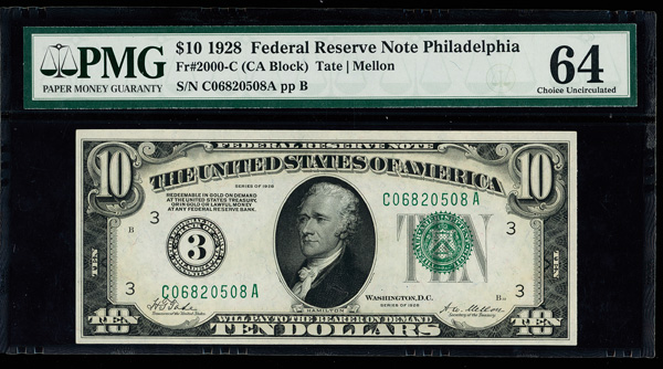 Fr. 2000-C 1928 $10 Federal Reserve Note Philadelphia PMG 64 Choice Uncirculated (Fr-2000-C), PMG graded Choice Uncirculated