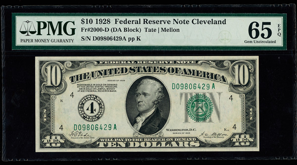 Fr. 2000-D 1928 $10 Federal Reserve Note Cleveland PMG 65 Gem Uncirculated EPQ (Fr-2000-D), PMG graded Gem Uncirculated