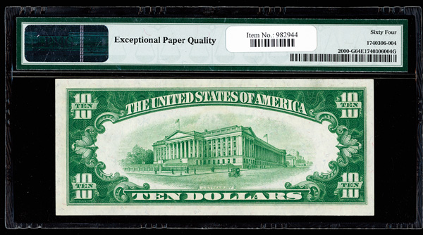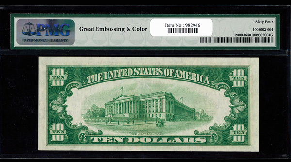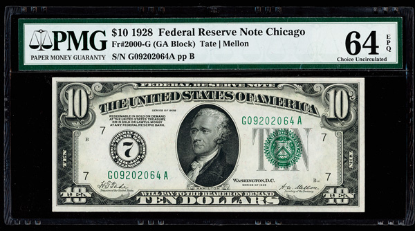 Fr. 2000-G 1928 $10 Federal Reserve Note Chicago PMG 64 Choice Uncirculated EPQ (Fr-2000-G), PMG graded Choice Uncirculated