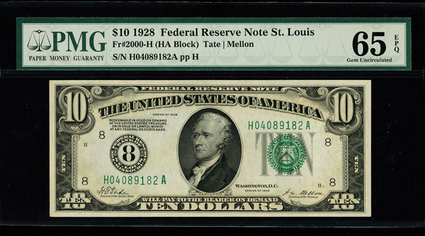 Fr. 2000-H 1928 $10 Federal Reserve Note St. Louis PMG 65 Gem Uncirculated EPQ (Fr-2000-H), PMG graded Gem Uncirculated