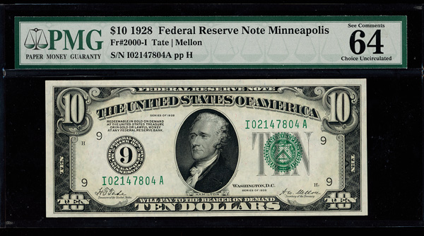 Fr. 2000-I 1928 $10 Federal Reserve Note Minneapolis PMG 64 Choice Uncirculated, noted as having Great Embossing & Color,