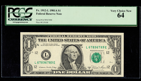 Fr. 1912-L 1981-A $1 Federal Reserve Note PCGS 64 Very Choice New (Fr-1912-L), PCGS graded Choice Uncirculated 64. (Image) (Image2)