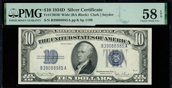 Fr. 1705 1934D $10 Silver Certificate Wide PMG 58 Choice About Unc EPQ (Fr-1705W), PMG graded Choice About Uncirculated