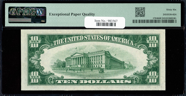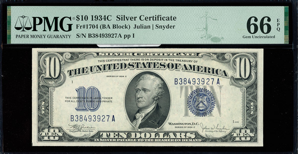 Fr. 1704 1934C$10 Silver Certificate PMG 66 Gem Uncirculated EPQ (Fr-1704), PMG graded Gem Uncirculated 66. (Image) (Image2)