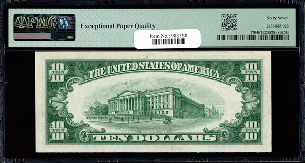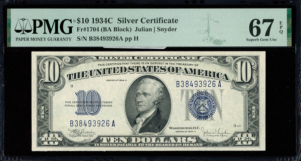 Fr. 1704 1934C $10 Silver Certificate PMG 67 Superb Gem UNC EPQ (Fr-1704), PMG graded Superb Gem Uncirculated 67. (Image) (Image2)