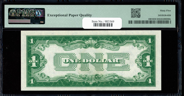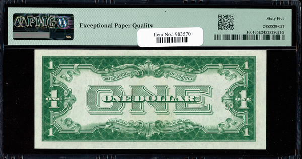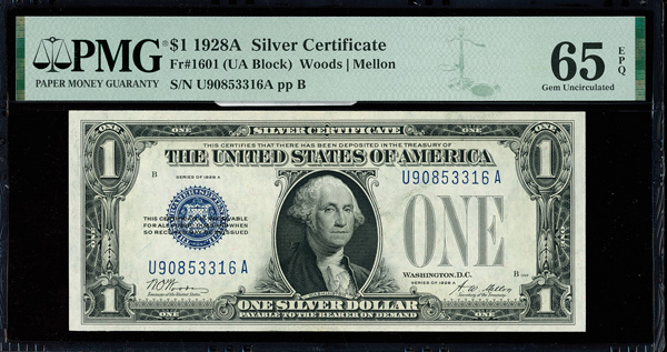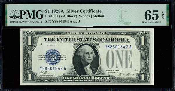 Fr. 1601 1928A $1 Silver Certificate PMG 65 Gem Uncirculated EPQ (Fr-1601), PMG graded Gem Uncirculated 65. (Image) (Image2)