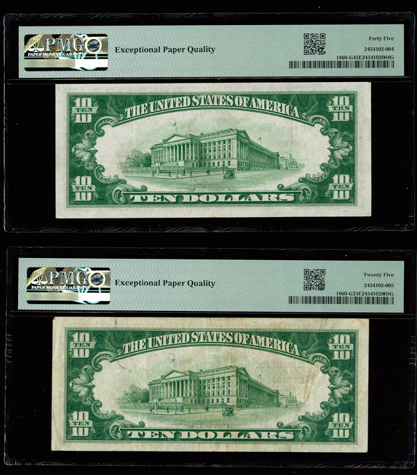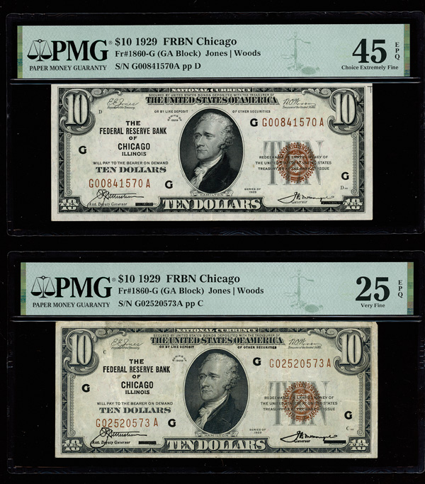 Group of (2) Fr. 1860-G 1929 FRBN Chicago PMG Graded Bank Notes (Fr-1860-G), group includes: (1) PMG 45 EPQ & (1) PMG 25 EPQ