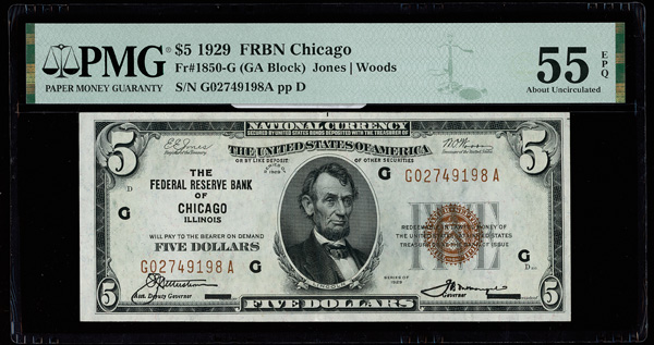 Fr. 1860-G 1929 FRBN Chicago PMG 55 About Uncirculated EPQ (Fr-1850-G), PMG graded About Uncirculated 55. (Image) (Image2)