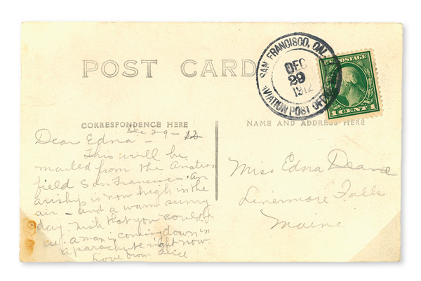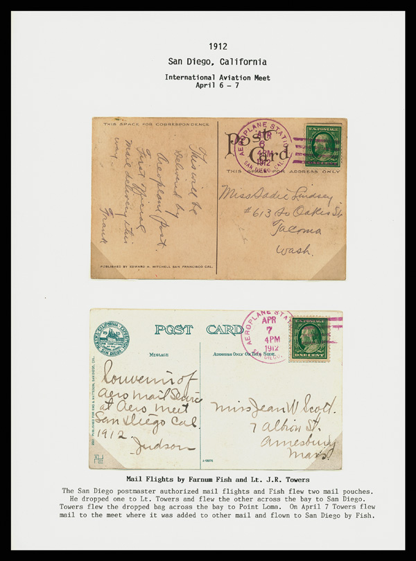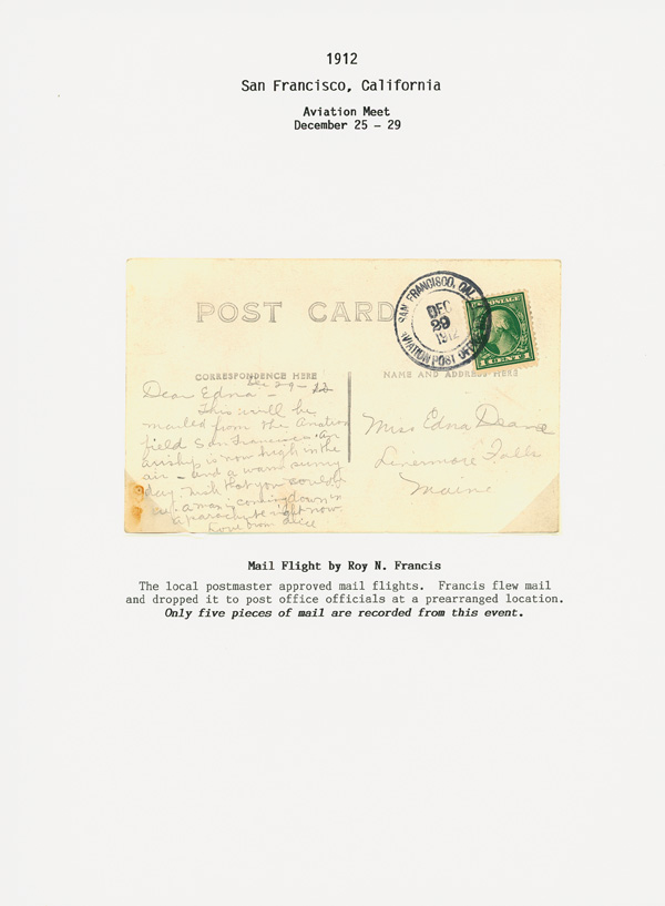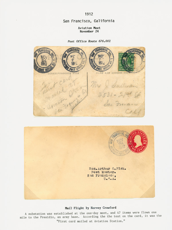 1912 (Nov. 24) Ingleside Park Aviation Meet, San Francisco, Cal. (AAMC 65), pilot Harvey Crawford flew 48 postcards and a