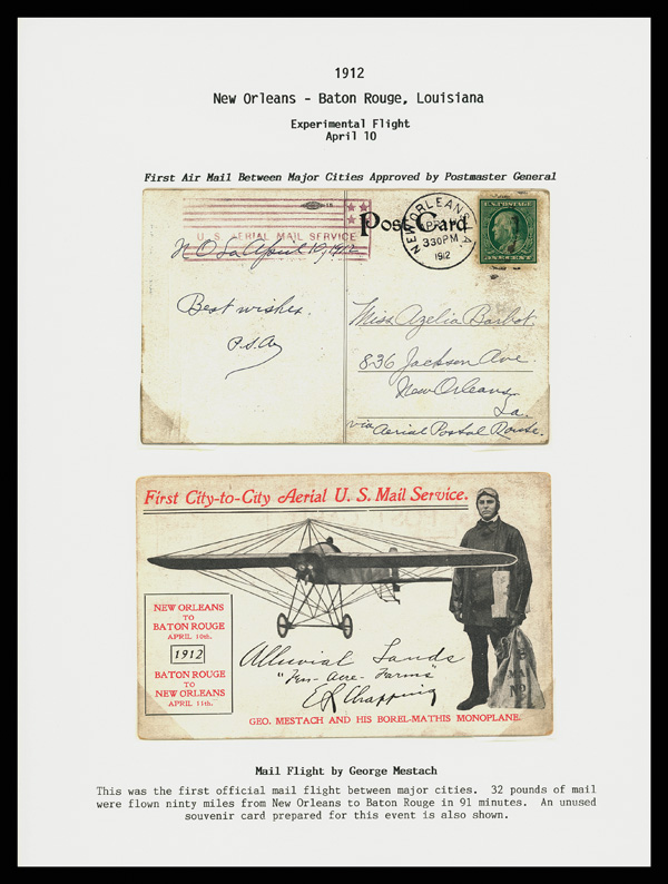 of airmail between major cities, George Mestach carried 32 pounds of mail in his Borel-Mathis monoplane between New Orleans and Baton Rouge; lot includes April 10 card, unflown City-to-City printed card, card postmarked in Baton Rouge for return