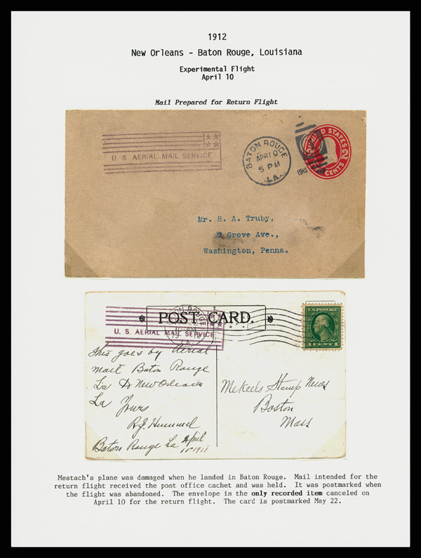 trip, and unique Apr 10 Baton Rouge envelope (unflown as Mestach's plane was damaged on landing at Baton Rouge; catalog $1,200, Fine to Very Fine. AAMC $400. (Image) (Image2)