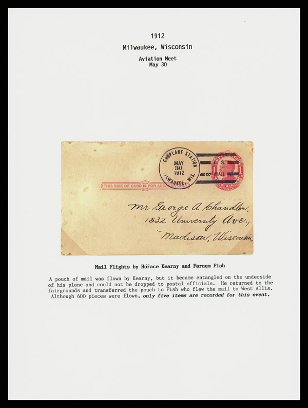 deliver copies of the newspaper; later on the first day, Horace Kearney planned to drop a pouch to postal officials but the bag got hung up in the undercarrage and required landing (and giving them to Fish) to deliver, Very Fine, 5 examples