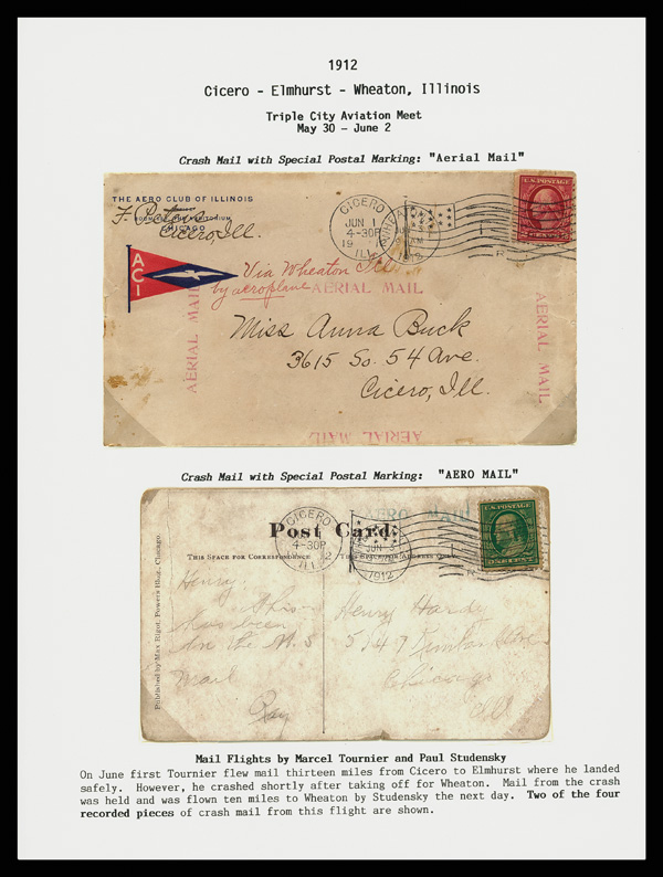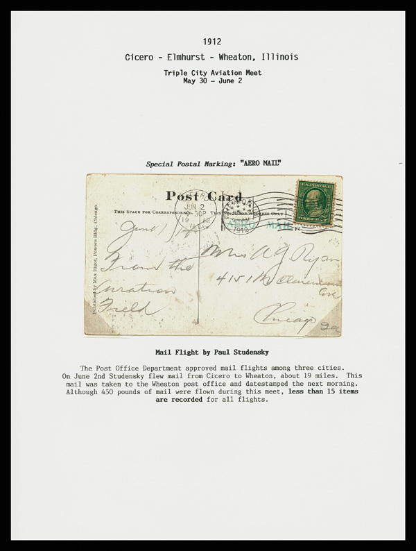 over four days, less than 15 has been reported; authorized by the Postmaster General, a postcard and envelope (Aero Club of Illinois corner card) flown Jun 1 (30d) it crashed shortly after taking off from Elmhurst; Paul Studensky piloted his craft to