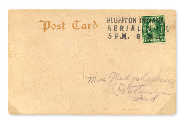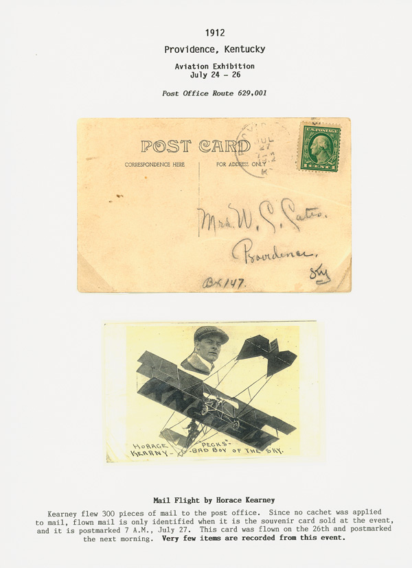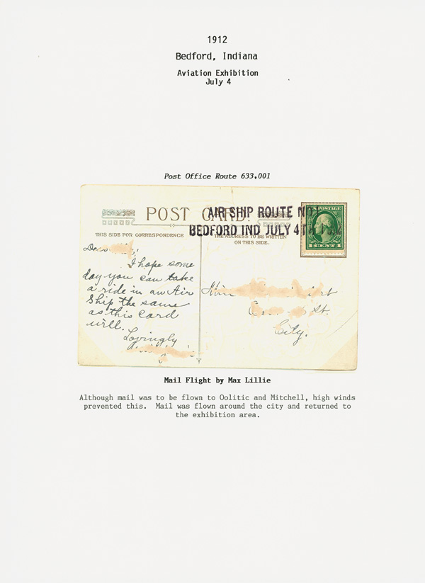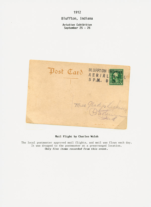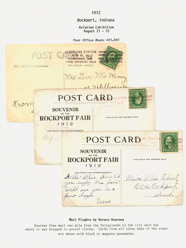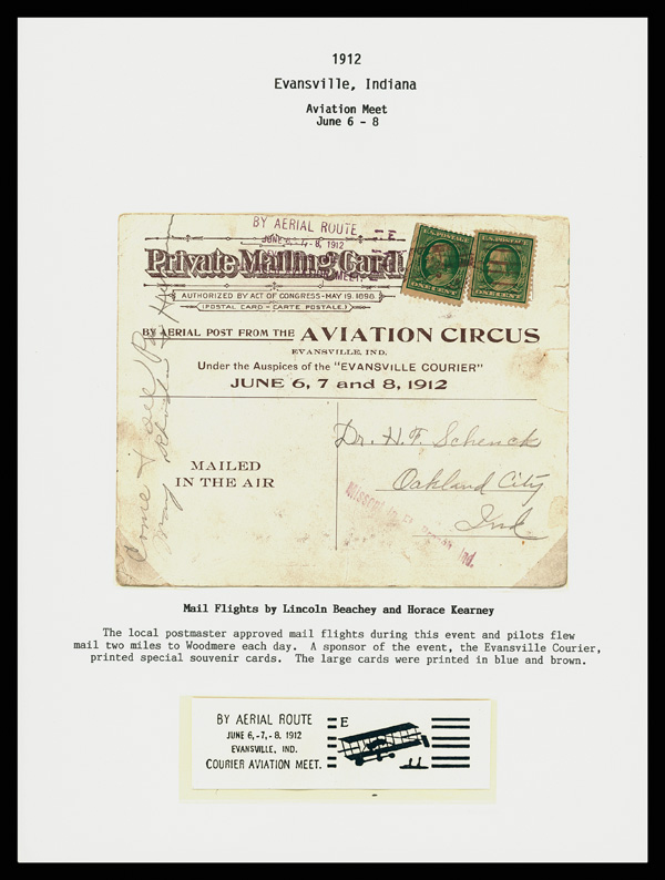 brown and another in blue, as well as a less common, smaller postcard, flown by Lincoln Beachey and Horace Kearney in Evansville; since the cancel covered the dates Jun 6-8, the only way to tell what day they were flown is if the sender wrote it;