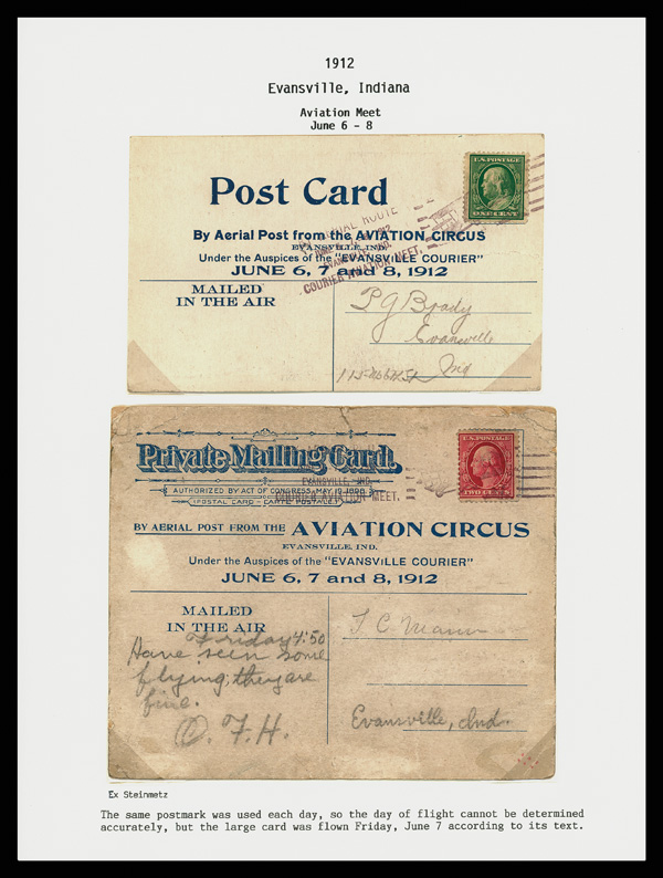 1912 (June 6-8) Evansville Courier Aviation Meet, Evansville, Ind. (AAMC 32a), three flown souvenir cards, a large card in