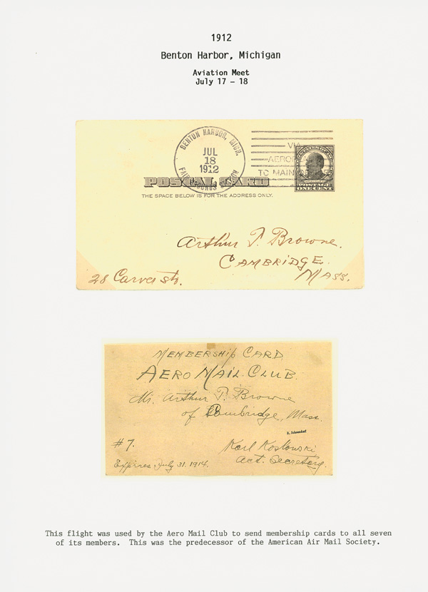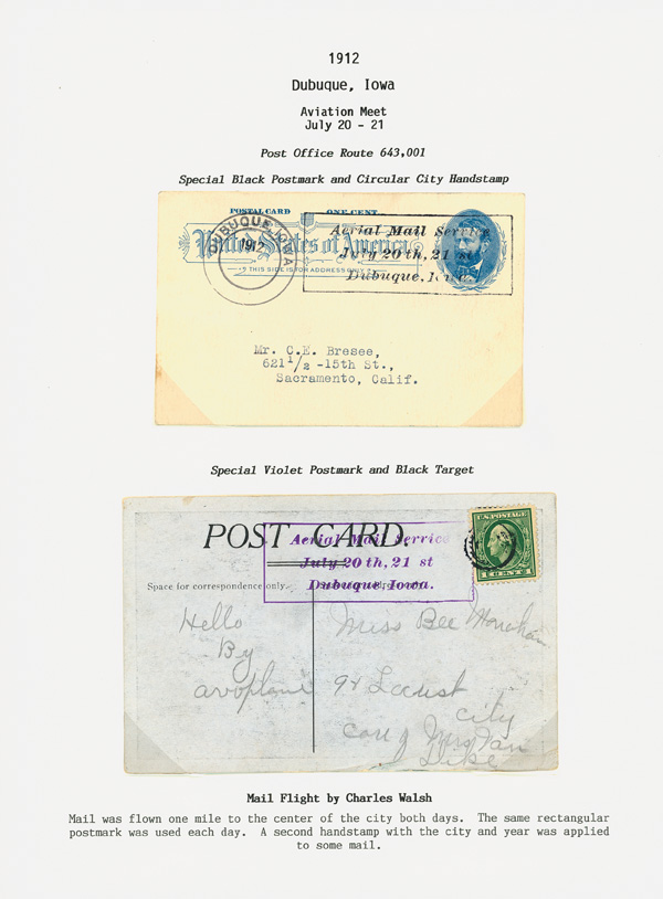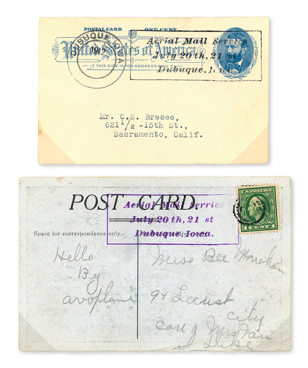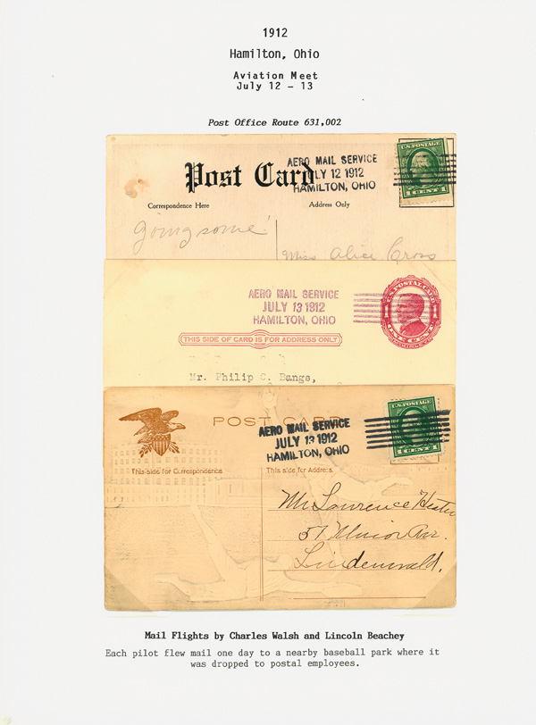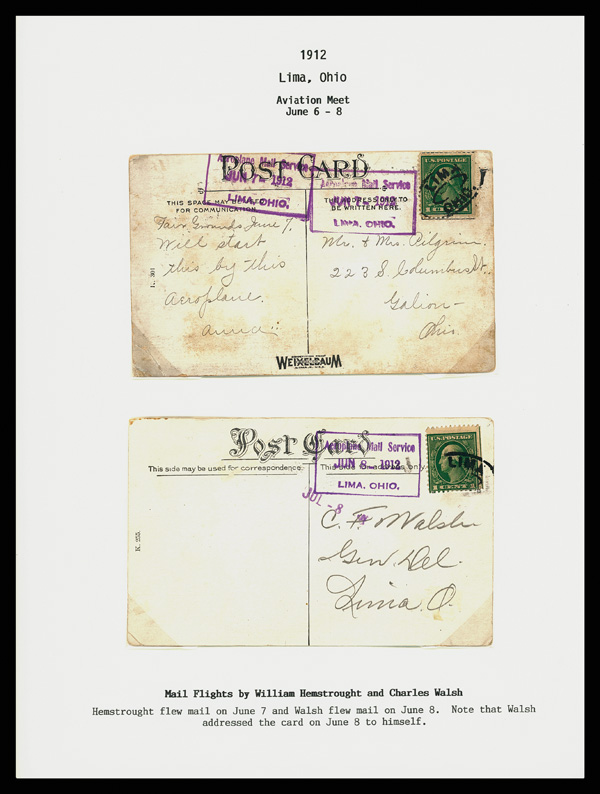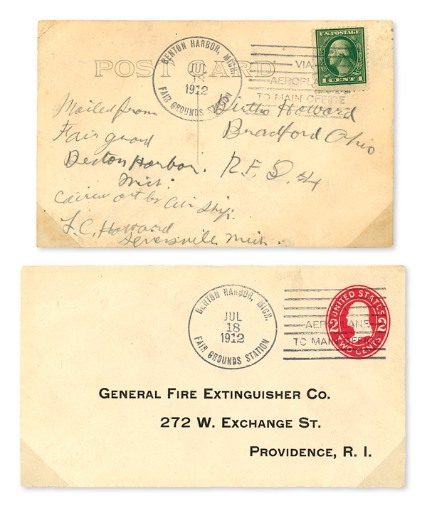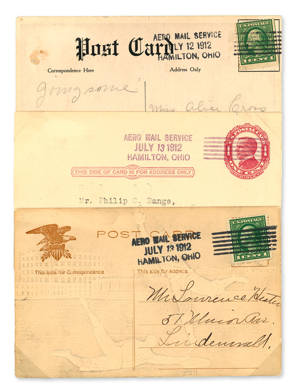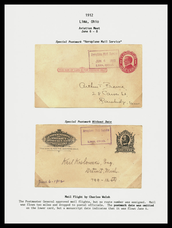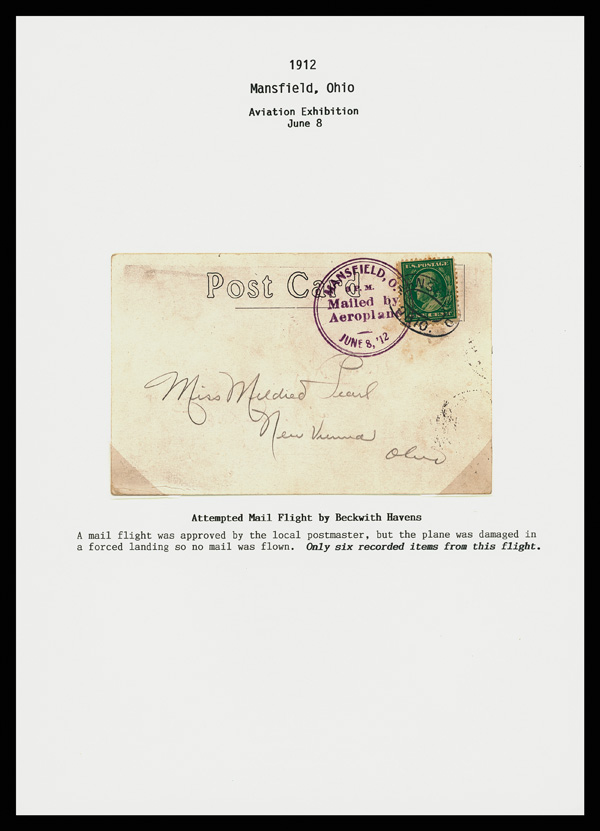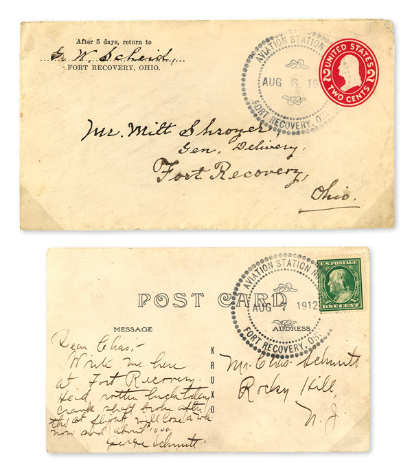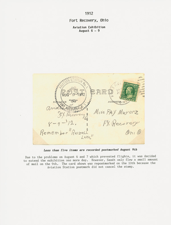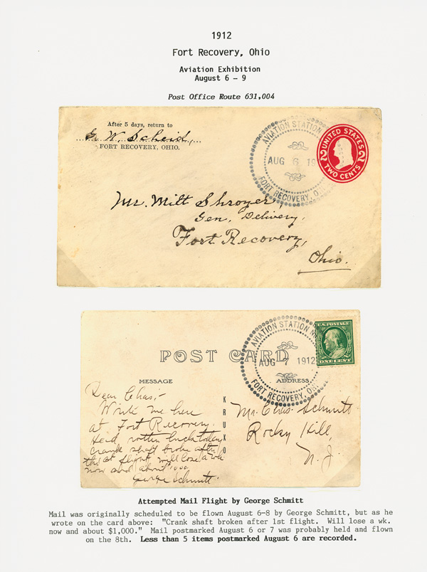 abortive aviation exhibition at Fort Recovery; scarce postal entire from Aug 6 (47), postcard from pilot to family on Aug 7 (47a and not flown) explaining that a busted crank shaft has delayed flights, an illustrated envelope also from the 7th, a