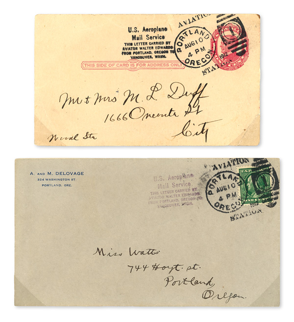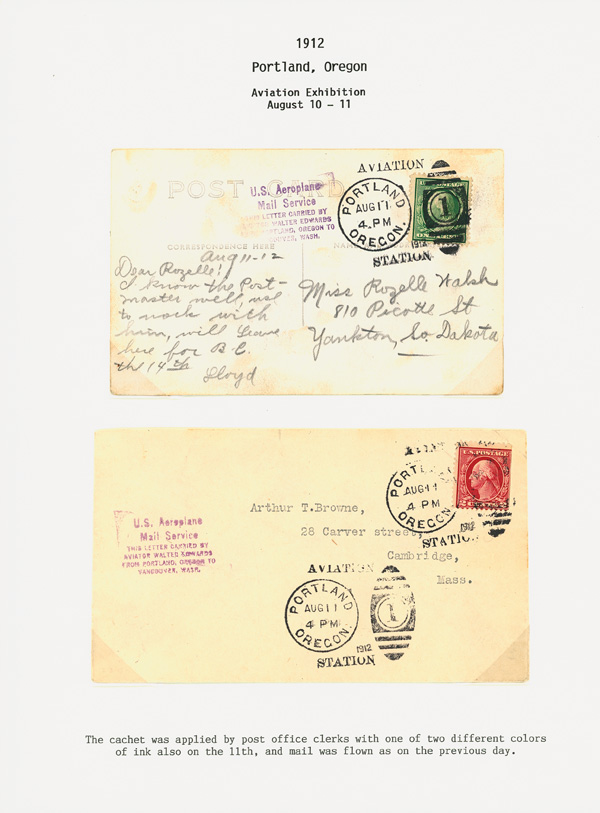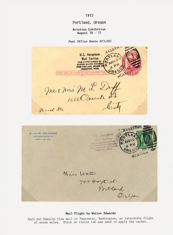 the Pacific Northwest, Walter Edwards flew seven miles from Portland to Vancouver; lot contains three exhibit pages including a postal card and envelope carried on Aug 10, a real photo postcard and cover flown on Aug 11, and flown facing slips