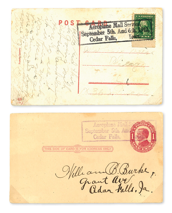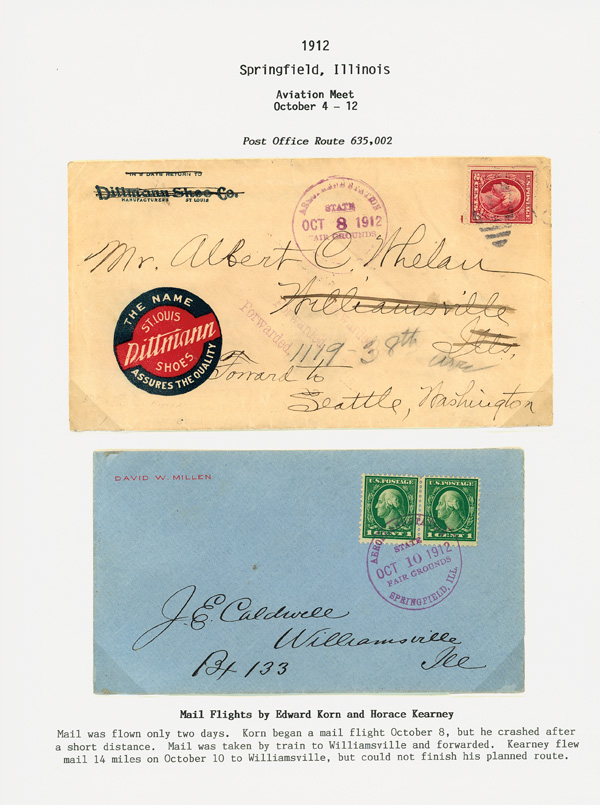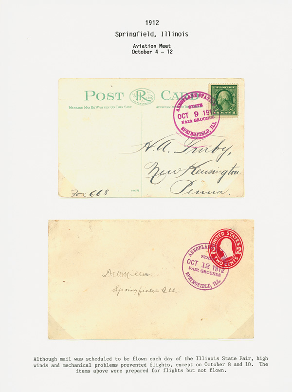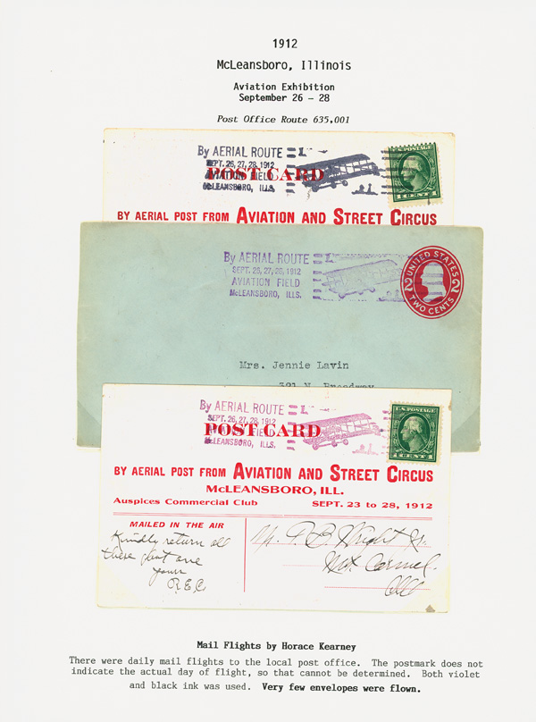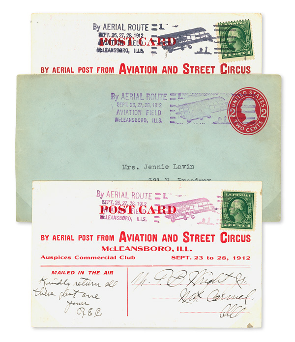 celebrate the Aviation and Street Circus in McLeansboro; lot contains a pair of postcards and one of very few envelopes carried; catalog $600, Fine to Very Fine. AAMC $200. (Image) (Image2)