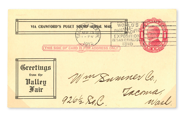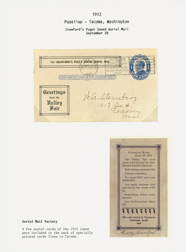 postal cards (Via Crawford's Puget Sound Aerial Mail) for the flight between Puyallup and Tacoma; lot consists of two cards with one autographed by the pilot; catalog $1,800, Fine to Very Fine. AAMC $900. (Image) (Image2)