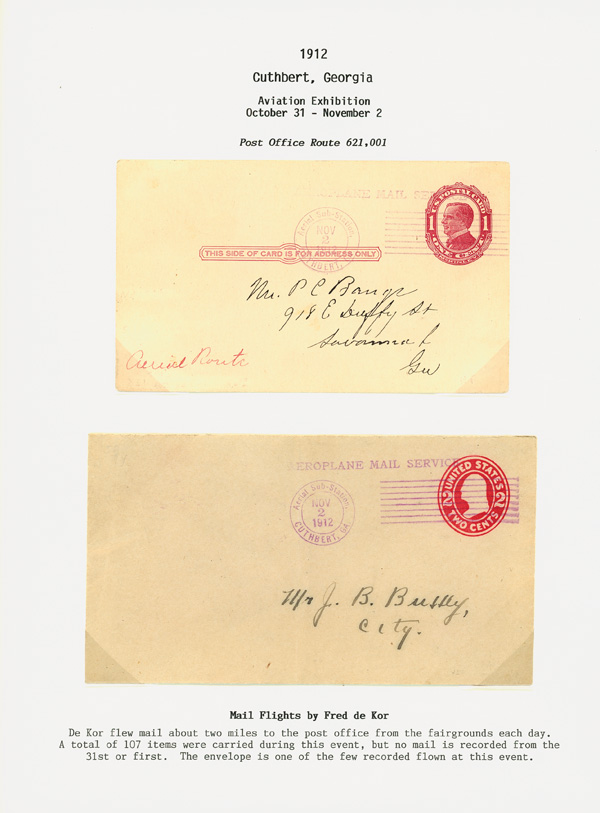 1912 (Oct. 31-Nov.2) Fair Grounds Aviation Meet, Cuthbert, Ga. (AAMC 64), a small amount of mail was lofted by Fred De Korn