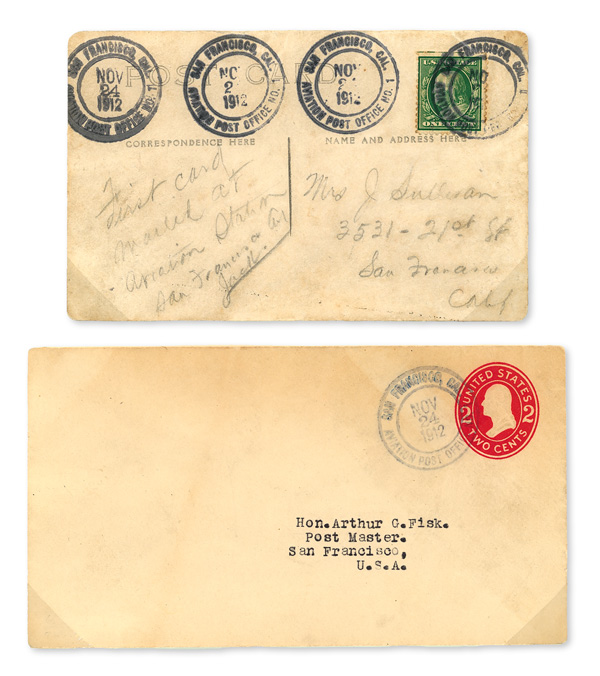 few envelopes from Ingleside Coursing Park to the Presidio, a miliary reversation in northwest San Francisco; postcard with four postmarks ("First card mailed at Aviation Station"), and a postal entire addressed to the Postmaster of San Francisco;