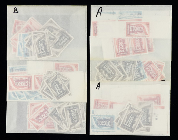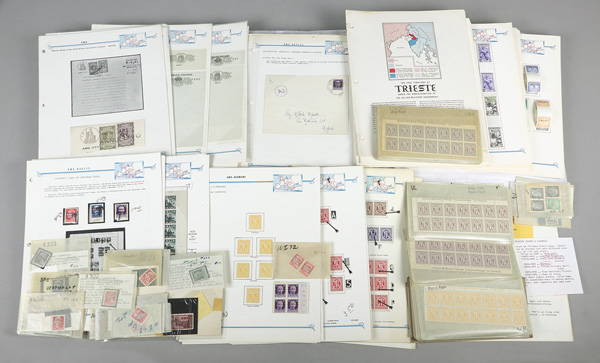 3688   imageEurope (Western), Unparalleled Mint Collection of the AMG Issues, 1943-54, We've offered a number of terrific collections of the A.M.G. over the years, but good luck on finding a better one than this collection on Joe Bush pages. We begin with Trieste (Zone A), virtually complete mint but that's only half the story with numerous gutter pairs including the "Natale Triestino" overprints, various proofs, like #159 (overprint in blue), 160 (overprint in red), and 162 (overprint in black), and overprint errors, such as 57 (double), 149 (triple), 162 (double), 163 (triple), these last four each with a certificate. There's also extensive coverage of the Venezia Giulia issues, two examples of the Badoglio essays, reconstructed panes of the A.M.G. issues for Austria & France, countless plate varieties of the U.S. printings for Germany, multiple pages of revenues including Letter of Exchange stamps, Stock Transfer Transaction forms, Motor Vehicle Driving License Tax, Military Permit Travel stamps, and others, as well as a pack of the A.M.G. issue for Germany in corner blocks of 14 sorted by paper type, and many other major varieties in glassines, such as inverted and displaced overprints. The end of WWII brought us not only peace but an awesome area to collect! generally Fine to Very Fine, additional images online. (PDF for this Lot) (Image)