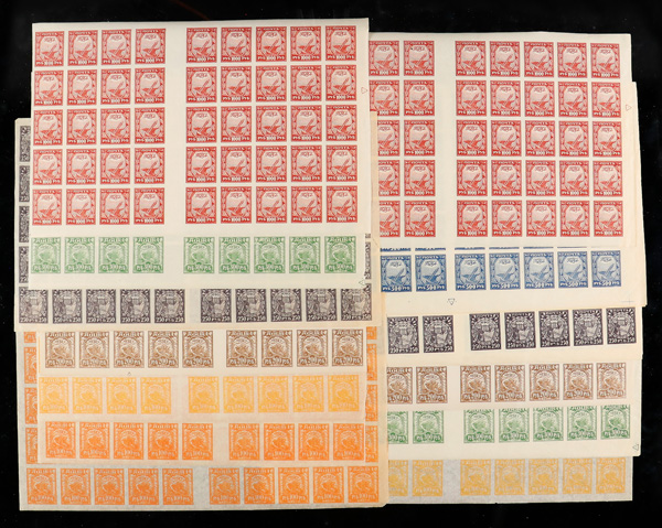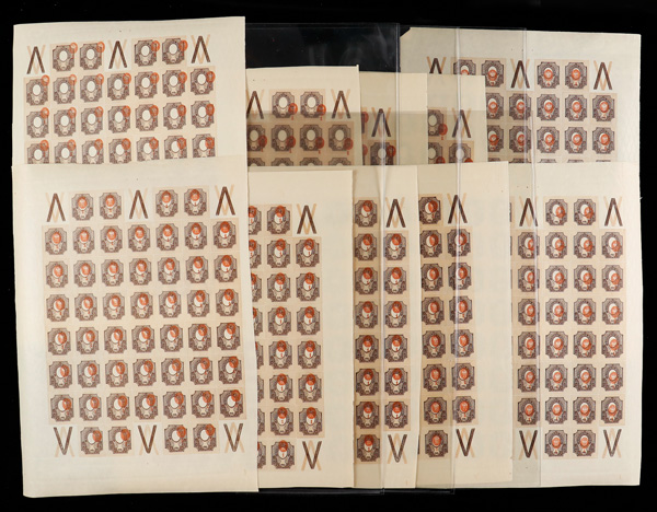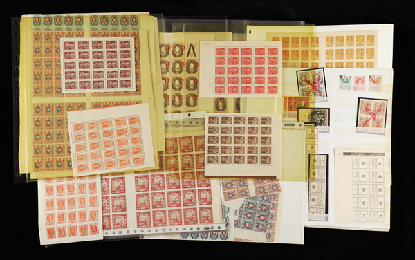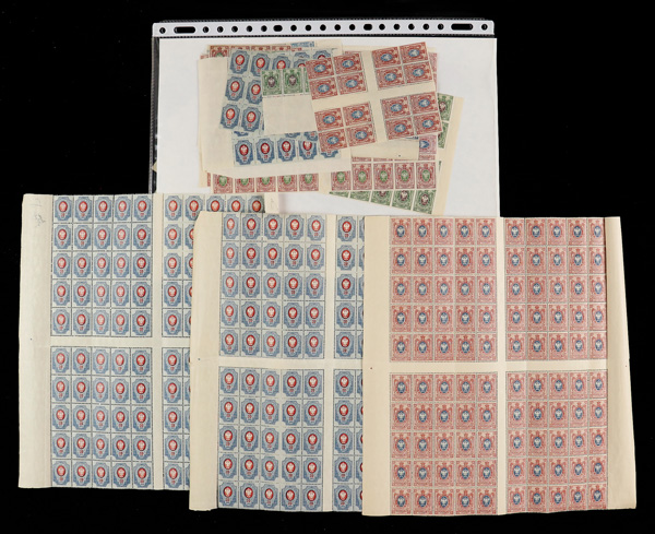 3712   image"From Russia and Others with Love" Russian Empire, RSFSR, Moldova, Ukraine, & Others Primarily Mint Accumulation, 1889-1994, an very attractive accumulation held on various loose stockbook pages and plastic sheet sleeves; features primarily Russian Empire and RSFSR material, specifically from the period of 1889-1924; many oddities, freaks, and errors included among this group, with Scott #45 imperforate sheets (10) with off-centered printings, sometimes dramatically; some typographical defects such as shifted printings in RSFSR material; includes a variety of #41-72 typographical errors, #75 in strips printed on gum, 92 special overprint, sheets and blocks of 105-107, 107-109 privately overprinted, 183 with extreme shift, a number of 216-22 error varieties, 237a sheets (2), 240 vertical shift, and other various shifted printings, gutter pairs, imperfs, and more; various mint blocks and partial sheets of the twenty sixth Russian Republic issue of 1917; complete sheets of #125, 126 (2), 181-186, 233, 241a, and 250 included; various independence overprint stamps from the 1990's from Moldova, Ukraine, and others featured as well; absolutely packed with desirable material; a truly wonderful assortment of material; please see photos online. Shipping charges apply - weight 5.2 lbs. (PDF for this Lot) (Image) (Image2) (Image3) (Image4) (All Images)