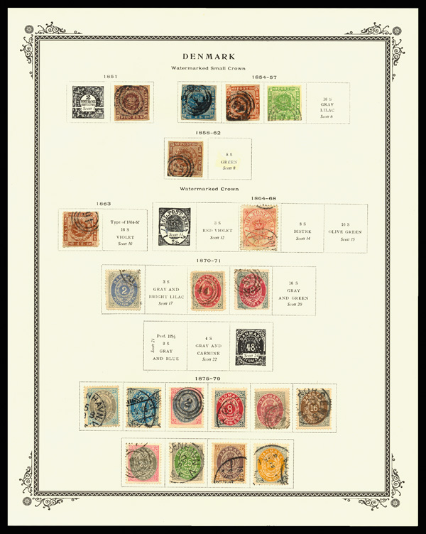 3698   Scandinavia, Advanced Strong in Mint Collections of Denmark, Finland, Greenland and Danish West Indies with Key Singles and Sets, 1851-1993, Another comprehensive collection from the Tiffanyate loaded with high quality singles and sets mainly mint with some better used as well and also much is Never Hinged even earlier issues. All neatly mounted in a thick well filled Scott Specialty album, Catalogue numbers and values are from Scott, Highlights include: 1 used $1000., 2-11 used $1128., 12-15 used $353., 16-20+24 used $672., 25-34 mint except 27 $560., 35-52 mint some will be N.H. all counted as o.g. $1058., 57-64 $310., 65-71 N.H. $621., 772-78 N.H. $525., 74-81 N.H. $185., 82 N.H. $1500., 85-134 mint much N.H. except 131 counted as o.g. $1095., 135 used $175., Commemoratives and Regular issues are very comprehensive from here to 1990 with much or even most N.H. Semi-Postals B1-B5 N.H. $267., Then complete to 1981, Air Post issues C1-C10 N.H. $1015., Postage Due J1-J7 mint N.H. $300., J8-J38 mint as o.g. (much is N.H.) $271., Official Stamps O1 mint $275., O2-O3 used $390., O6-O24 mint with much N.H. Parcel Post Stamps Q1-Q9A $1360., Q12-Q30 N.H. $350., Newspaper Stamps P1-P10 mint some appear N.H. counted as o.g. $870., P11//P20 mint $523., also Late Fee, Military Issues and Thule Distrit, Finland is all mint with key stamps and sets, the Mint includes: 4 $800., 6 (2 copies) $600., 7 $275., 9 $500., 10 $450., 12 $290., 18+23 $400., 38-45 Less 41 $450., 46-58 N.H. $1164., 69 N.H. $550., 70-75 N.H. $330., 82 N.H. $270., 83-118 N.H. $285., plus the balance of mint N.H. issues up to 1993., Semi-Postals from 1922 up to 1993 all mint N.H., Air Posts 1930-1970 mint N.H., Parcel Posts, Karelia N1-N27, Finnish Occupation of Russia "Aunus" overprints mint N1-N6+N8 $1090., Danish West Indies is a better collection all mint with much N.H. An all mint collection of Greenland follows with the key sets 19-27 N.H. $1350., 22a-27a N.H. $2900., As noted earlier there will be more Never Hinged in the earlier issues counted as o.g. and it is possible that we missed a call on N.H. but this should be a minor issue with these outstanding collections with an array of very scarce issues. The condition is Fine to Very Fine or better with very fresh colors, a few faults in the 19th century issues are minor in these important holdings. Well worth serious consideration. Ex-Tiffany.