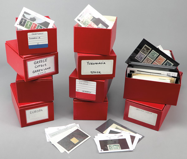 3682   imageEurope, "Trump Card" Tremendous Mostly Mint Holding of "102" Cards into the 1990s, A total of eleven red boxes (10 short, 1 long) with 1000's of "102" cards, virtually all labeled with Scott number and a good portion of it with catalogue value. And if someone tells you there's nothing of value here, that's fake news! Extensive Andorra, Austria, British Commonwealth, Eastern Europe, Luxembourg, Switzerland, Trieste, and more. Better mint sets & singles include Austria #380 (yes, a Dollfuss, very lightly hinged), 431 (signed), B106-09, B138-41, B269-71, Belgium C12, Q437, Iceland 163 (block), Luxembourg 318-20, Norway 32-34, Spain 668-71, B60-63, Switzerland 182, 185, 200-03, 206, 209, B2-3, B4-6, B7-9, and many others. Win bigly by placing your bid today! Believe me, it's going to be great, overall Fine to Very Fine, additional images online. Shipping charges apply - weight 23.6 lbs. (PDF for this Lot) (Image)