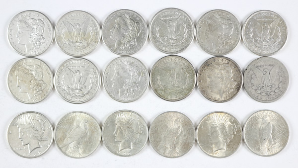 Group of (18) Mixed Dates $1 Morgan & Peace Dollars, 1879-1923, condition ranges from G-AU; dates vary; please inspect