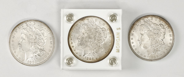 Group of (3) "O" $1 Morgan Silver Dollars, 1883-1888, includes 1883-O, 1885-O, and 1888-O, Brilliant Uncirculated. (Image) (Image2)