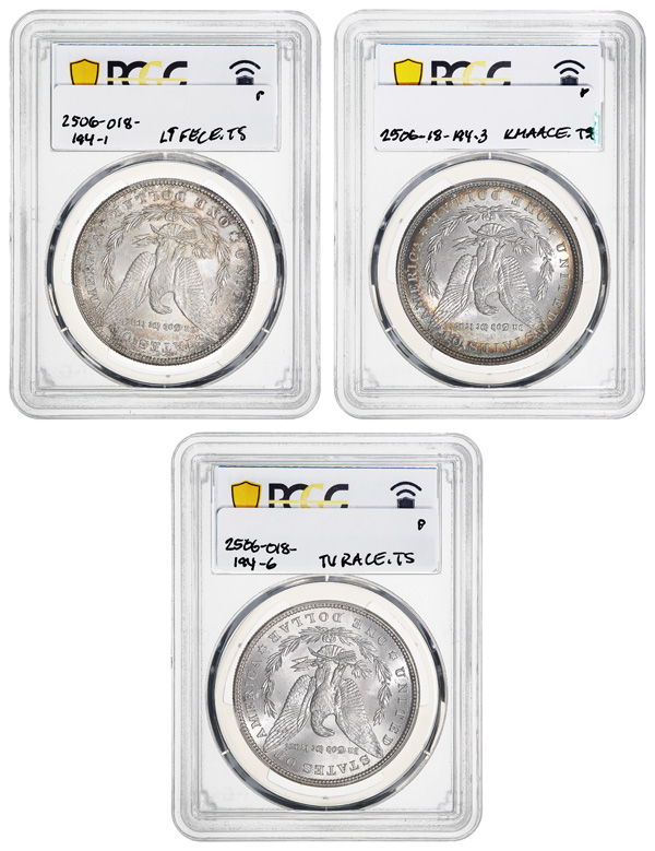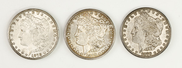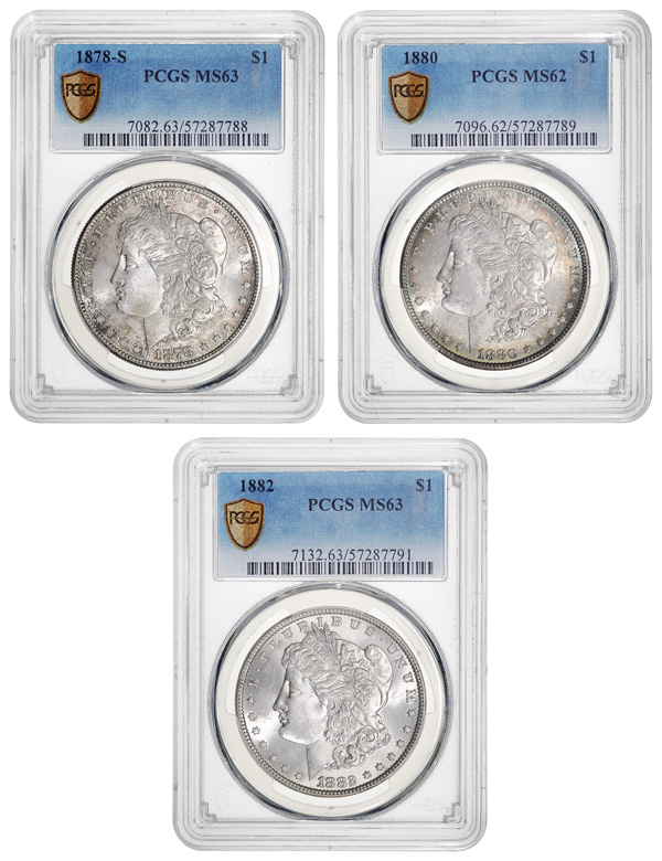 Trio of PCGS Graded MS Morgan Dollars, 1878-S, 1880, 1882., 1878-S. MS 63, 1880. MS 62, 1882. MS 63. (3). Shipping charges