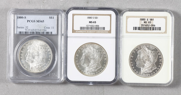 Group of (3) 1880-S $1 Morgan Silver Dollars Graded MS65, includes: (1) 1880-S PCGS MS65 & (2) 1880-S NGC MS65. (3).