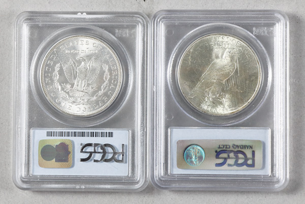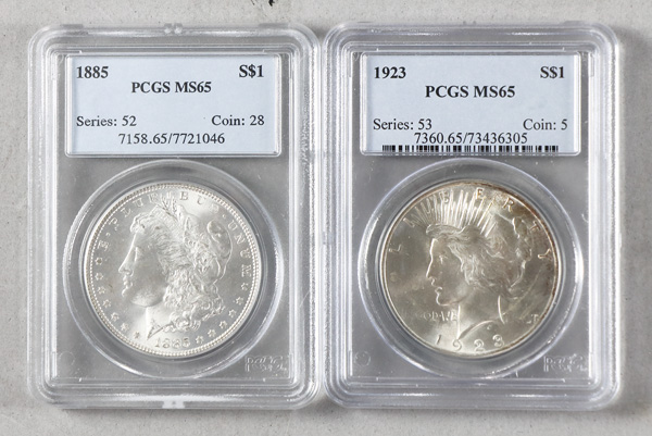 Group of (2) Silver Dollars (1) 1885 Morgan Dollar PCGS MS65 & (1) 1923 Peace Dollar NGC MS65. Shipping charges apply -