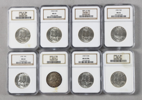 Group of (8) 50C Franklin Half Dollars NGC Graded, 1954//1963, includes: (1) 1954 NGC MS65 (3) 1954-S NGC MS65 (1) 1956 NGC