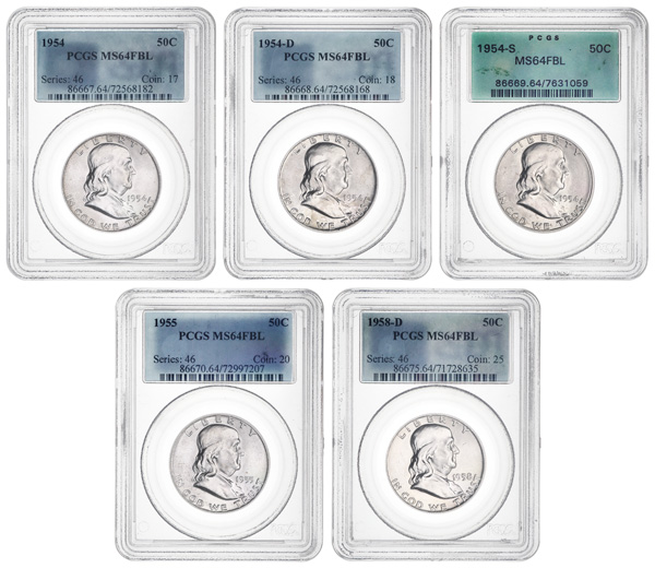 Group of (5) 50C Franklin Half Dollars PCGS Graded MS64 FBL, 1954//1958, years include: 1954, 1954-D, 1954-S, 1955, & 1958-D
