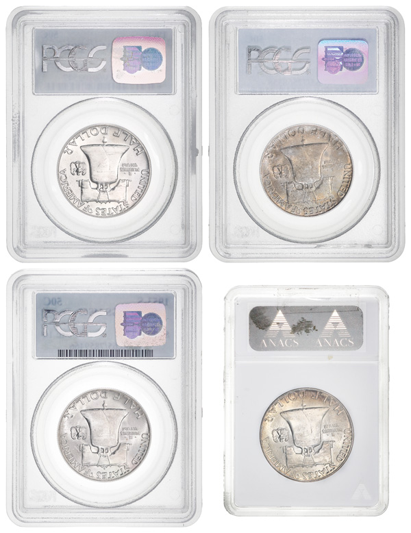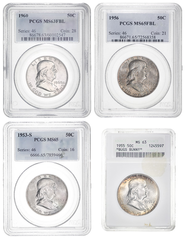 Group of (4) 50C Franklin Half Dollars Graded, 1953//1960, includes: 1953-S PCGS MS65, 1955 "Bugs Bunny" ANACS MS63, 1956