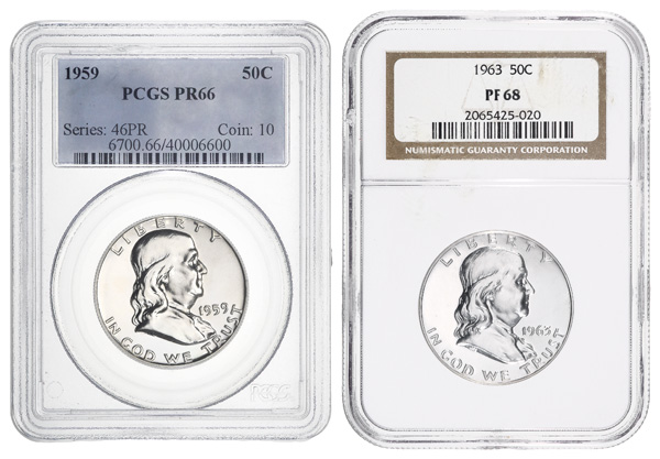 Group of (2) 50C Franklin Half Dollars Graded Proofs, 1959//1963, includes: 1959 PCGS PR66 & 1963 NGC PF68 (2). (Image) (Image2)