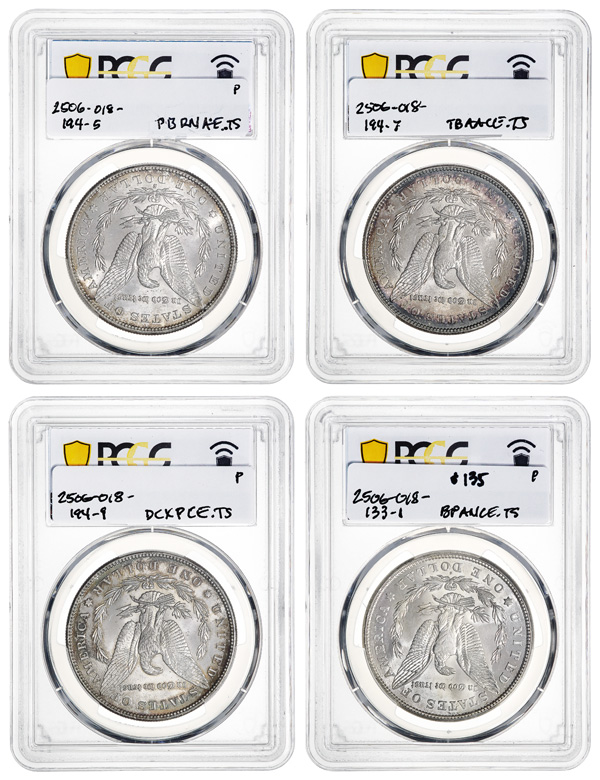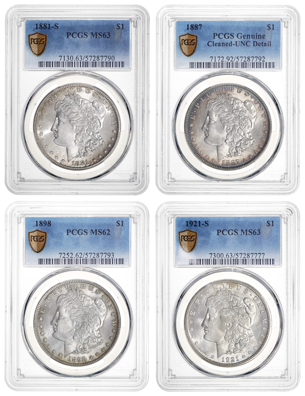 Quartet of PCGS Graded Morgan Dollars, 1881-1921-S, 1881-S. MS 63; 1887. Cleaned-Unc Detaill 1898. MS 62; and 1921-S. MS 63.