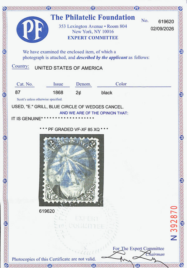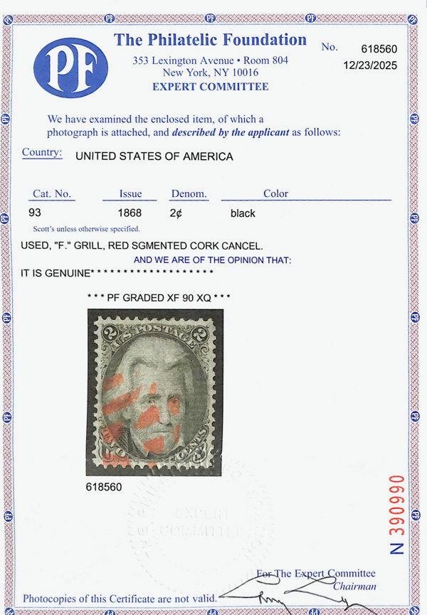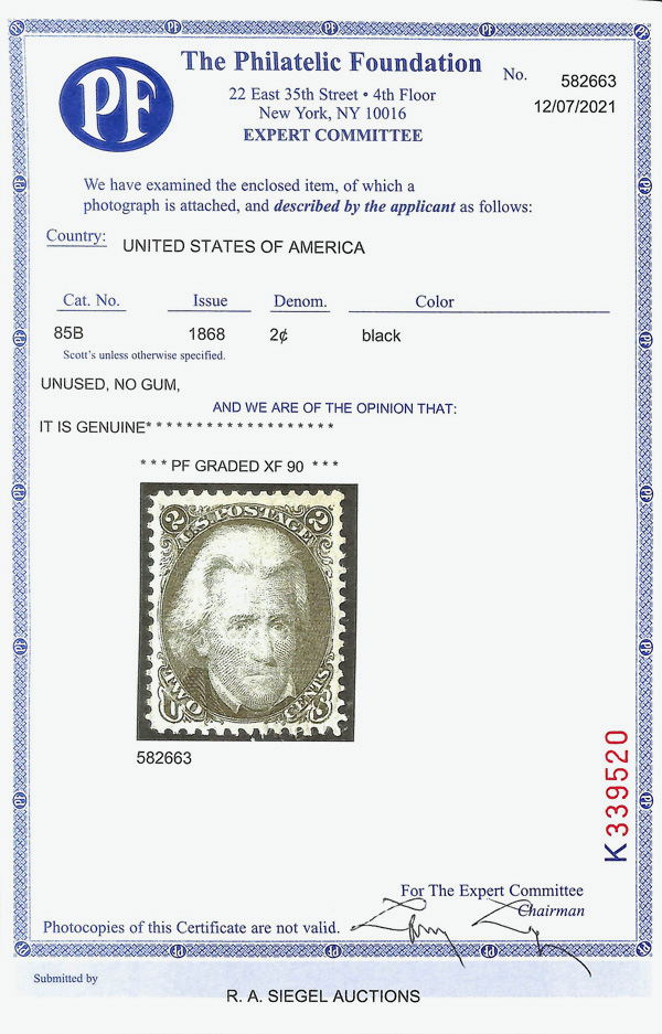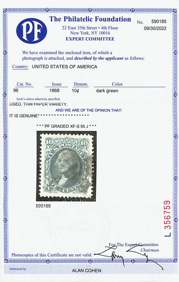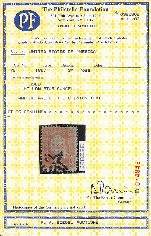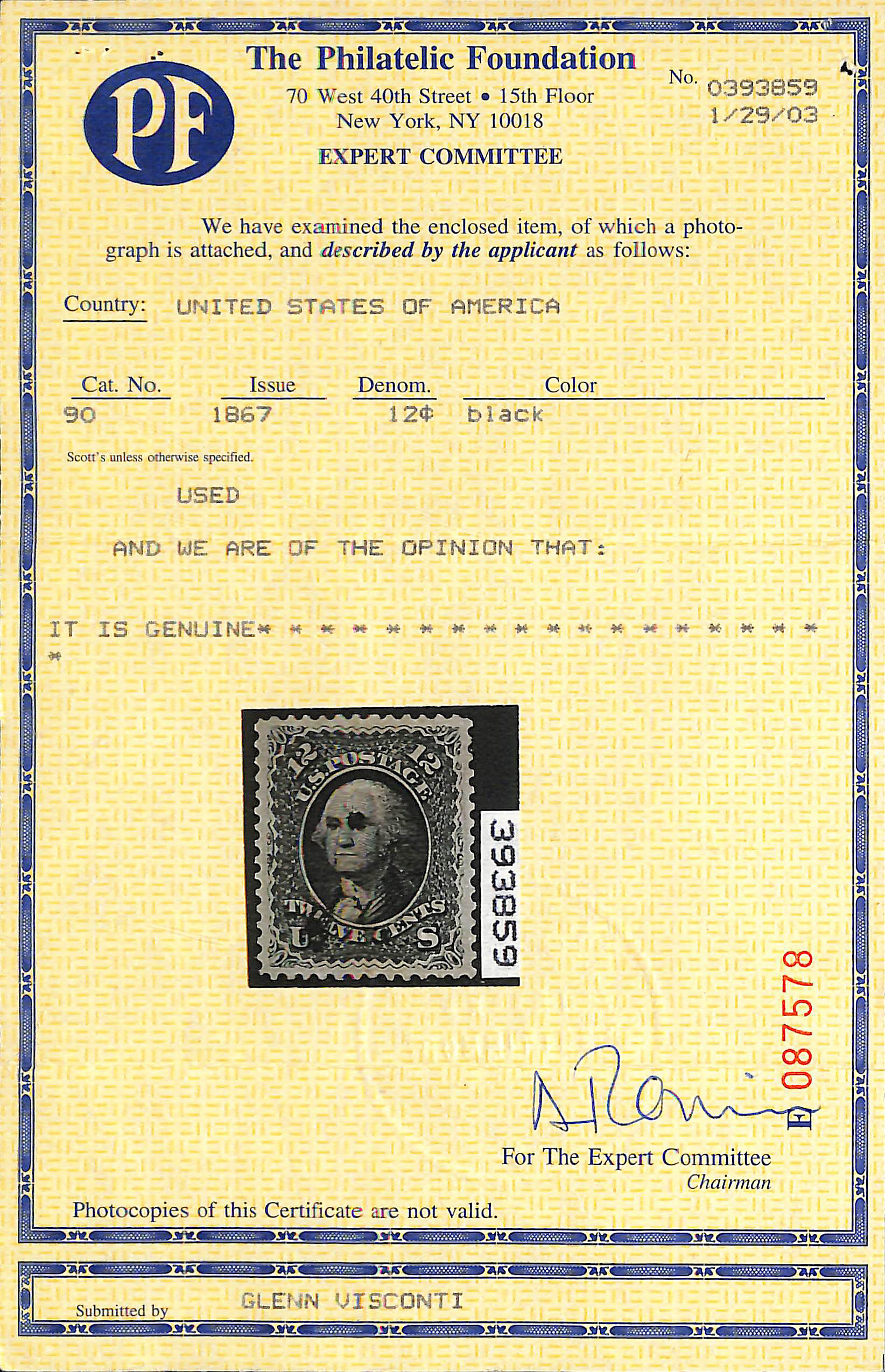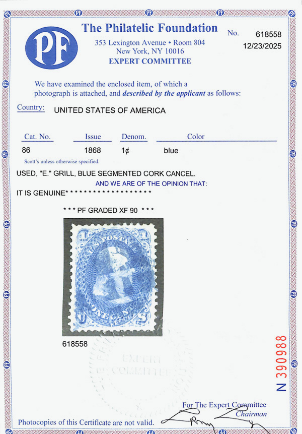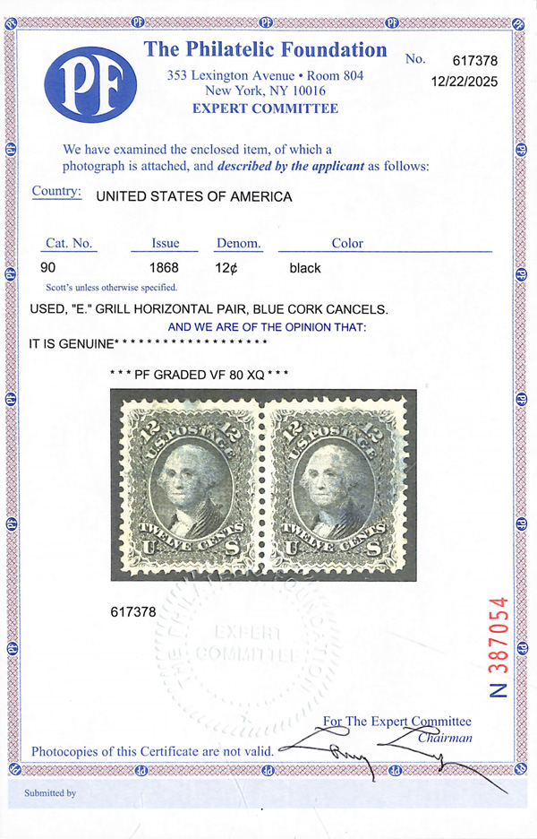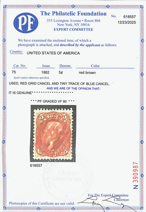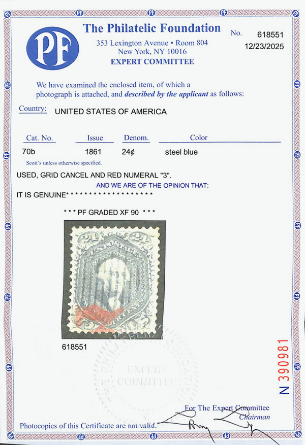 ex Dr. Rorke, Golin, Wingate, Przybyl, with 1976, 1994 and 2021 P.F. certificates, the last graded XF 90. SMQ XF 90; $9,000. Scott $8,000. (Image) (Image2)