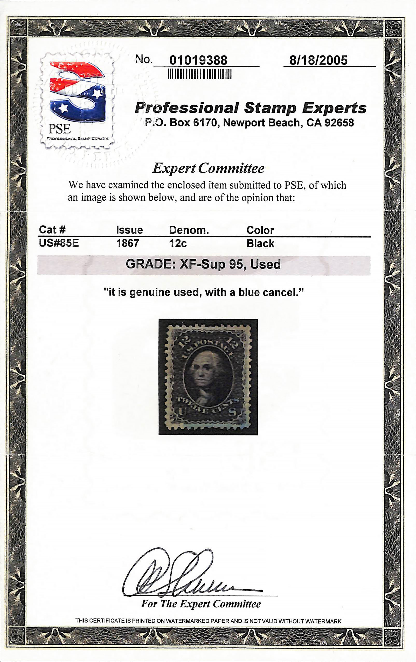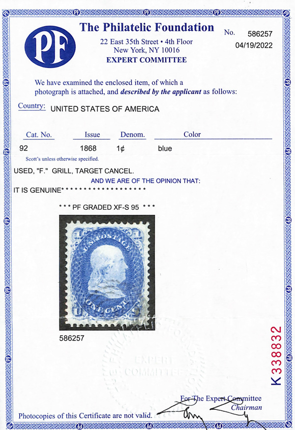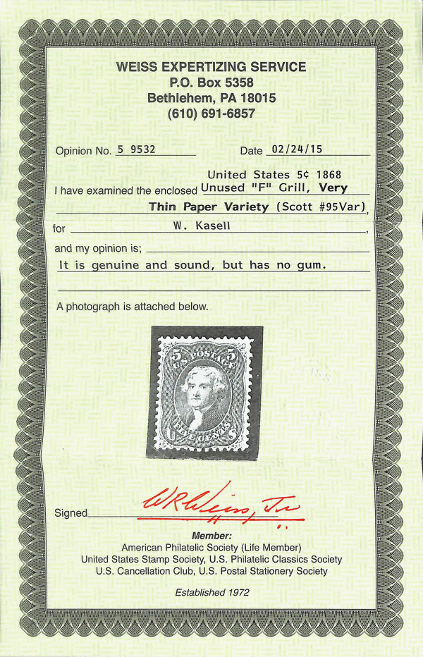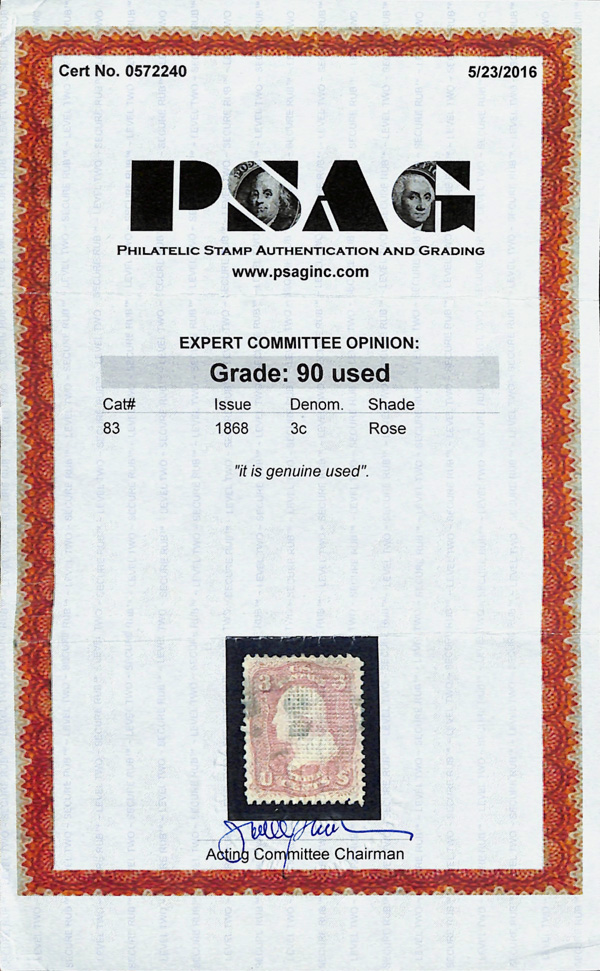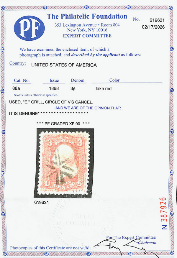 beautifully centered and sound with strong grill; one of the scarcer regular issue grills and very rare this nice unused, Extremely Fine. A Pop Topper, the highest grade awarded a no gum stamp in PSE's Population Report being a single 85,