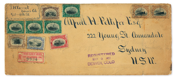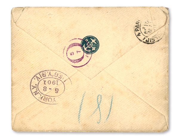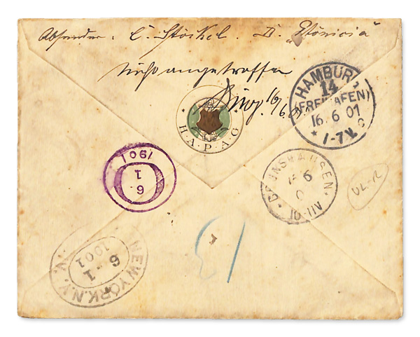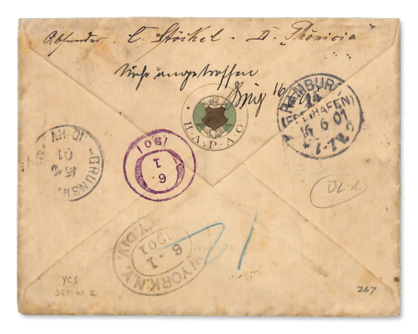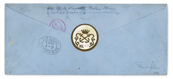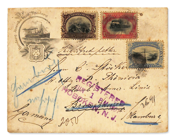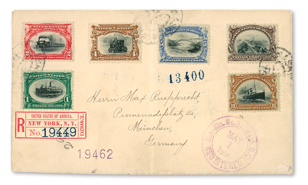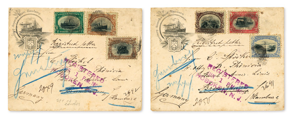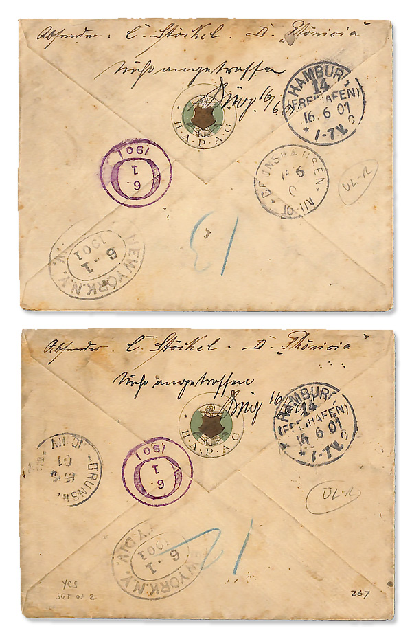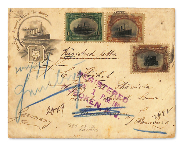 numbers (19468/19450), and that cover is backstamped NY and Munich. Furthermore, there are two other covers with the same arrangement of stamps, Washington D.C. substation cancel color and location, registry label placement addressed in the same hand