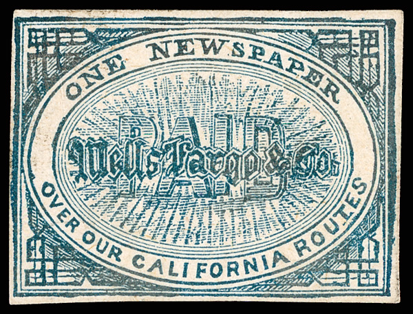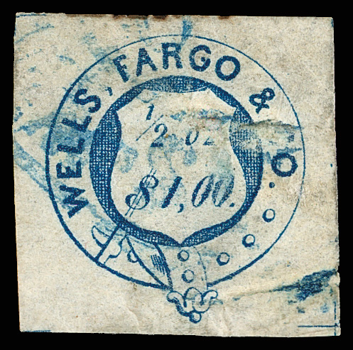 Wells Fargo & Co., 1861-1864 issues (Scott 143L2-143L4, 143L7-143L9), all 4-margin singles, Nos. 143L2 o.g., 143L3 disturbed