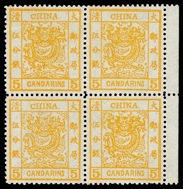 1878, Large Dragon on thin paper, 5ca orange (Chan 3. Scott 3), right margin block of 4, a remarkable multiple, wonderfully fresh with bold, vivid color, o.g., never hinged; a couple ever-so-slightly discolored perforation tips mentioned solely for accuracy, Very Fine, choice. Scott $5,800 as singles (HK$ 44,620). Est. HK$20,000-26,000....Est. HK$20,000-26,000