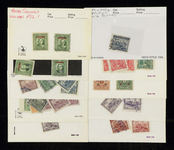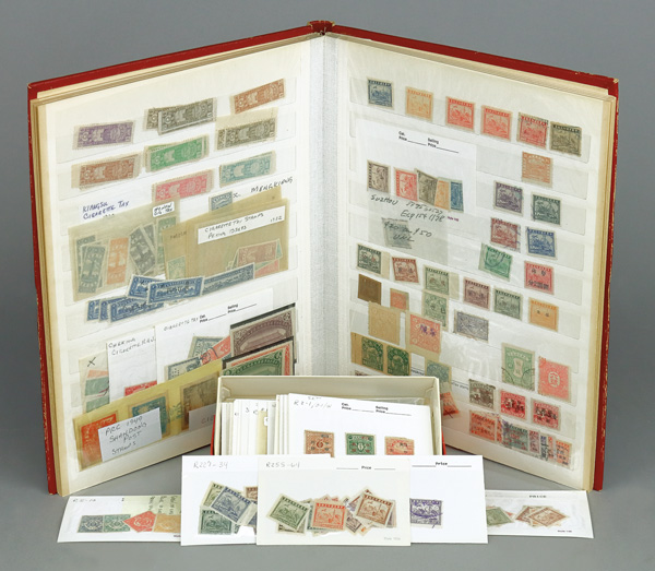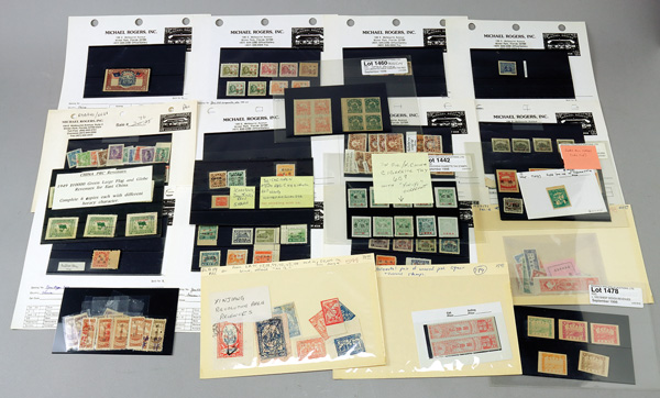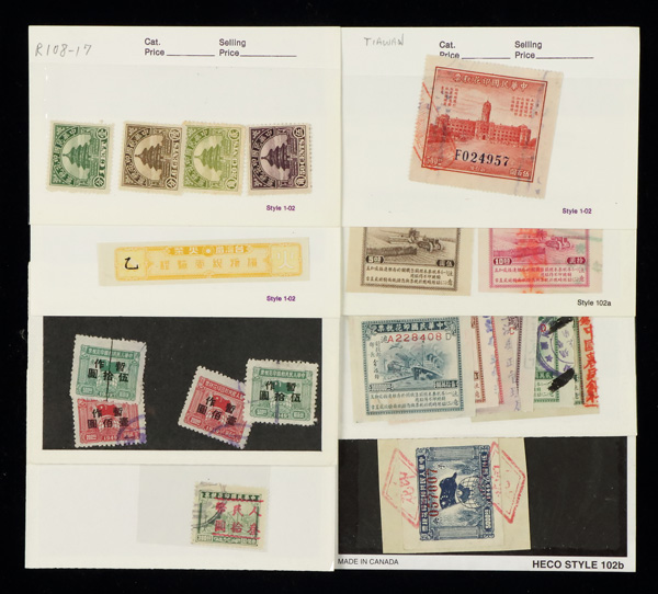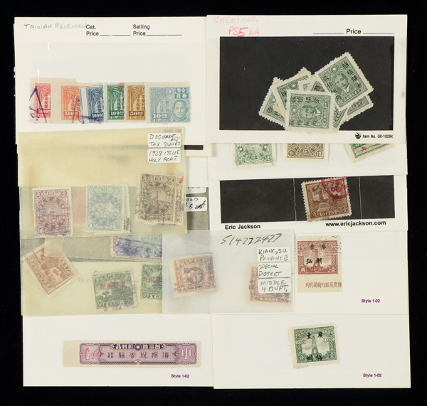descriptions still attached, offering a wide range of types and uses; we note a 10c Opium Revenue, several Republic Xinjiang Province Revenues, Taiwan-Quemoy stamps or sets, Taiwan issued for use in Peng Hu (Pescador Island, Philippines) plus Kinhu,
