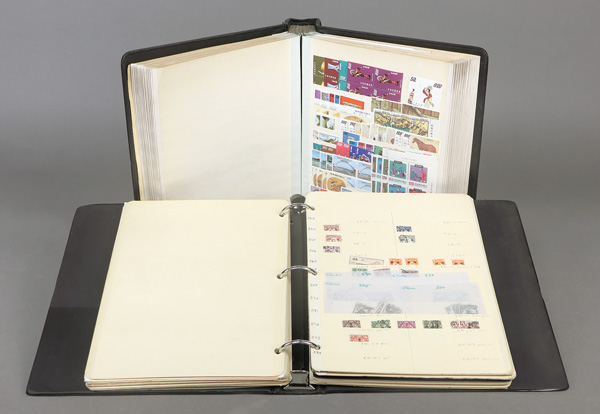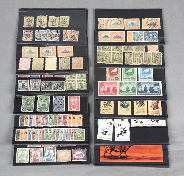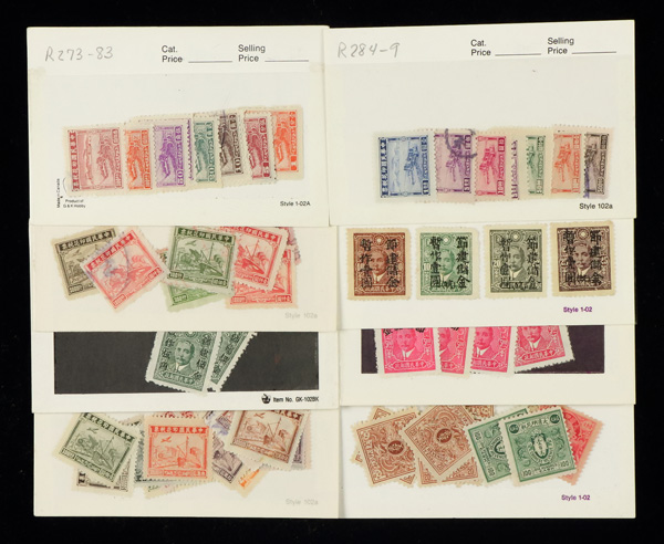 (16-side) stockbook and in a small box of #102 cards, mixed mint and used, with much if not most identified; mainly singles, but we note a couple pairs or blocks, even several on-piece or on-document uses; extensive Great Wall types and special use