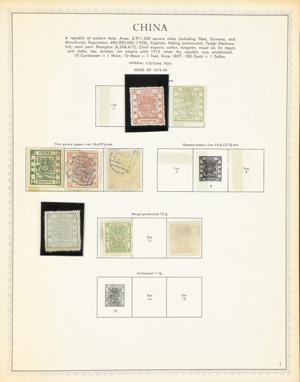 values plus Foochow, Nanking and "Republic" overprints; solid Golds and Silvers, Back-of-the-Book with Airs, Semi-Postals and Dues among others; Taiwan Provincial, Black Flag Republic and post-1949 issues (the latter appearing highly complete with