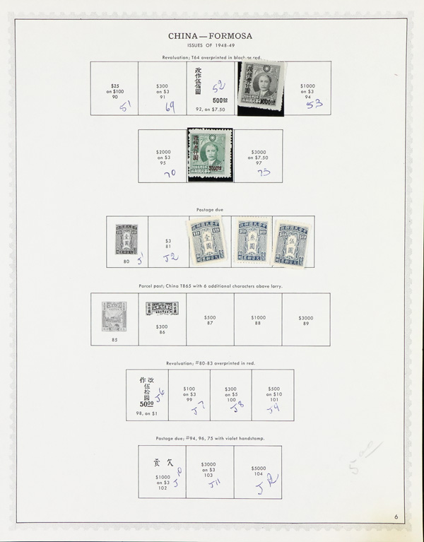stockpages with much identified by Scott; Republic includes Provincials and Japanese Occupations, with a handful of Empire Postage Dues (including #J1-J6 both mint and used); strength of the holding lies in Taiwan, featuring