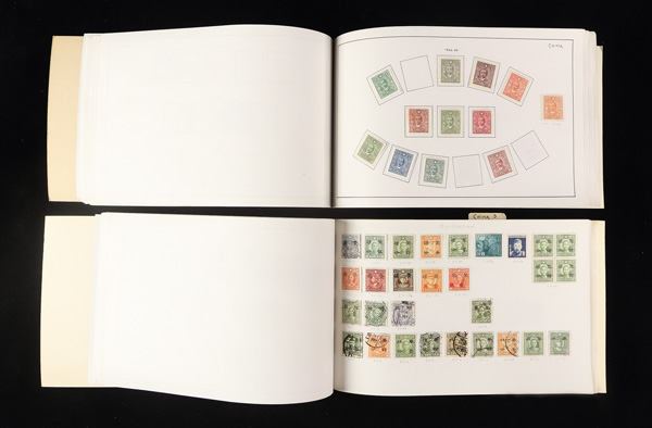 identified by issue year, starting with Small Dragons and running through the end of the Republic; volume one houses definitives and commemoratives, volume two holds Airmails, Dues, Provinces and Offices, Japanese Occupations, and a pretty array of